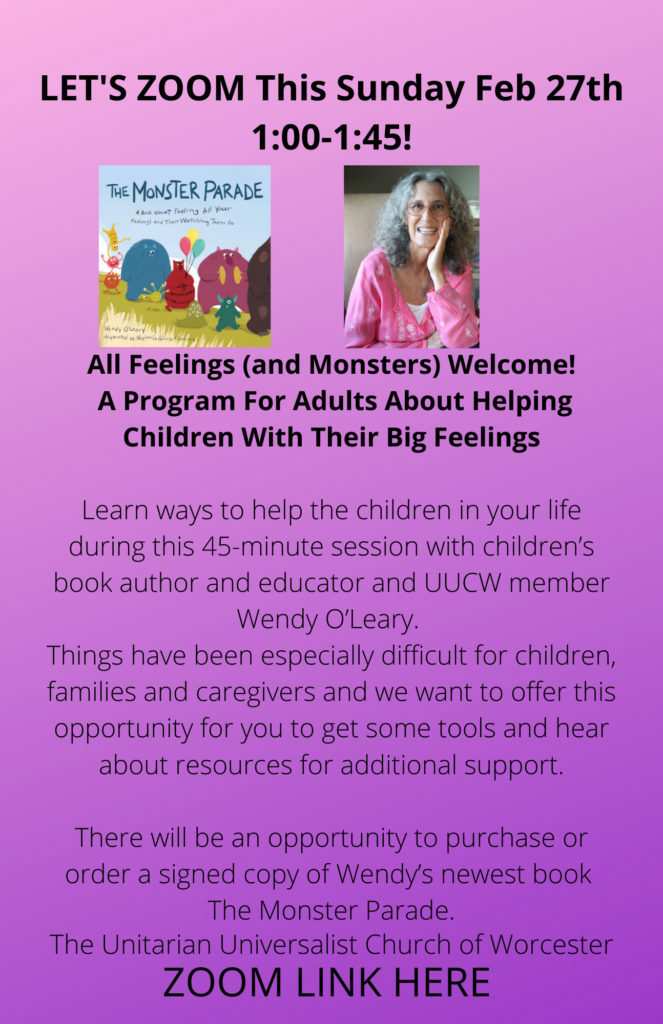 This Sunday, February 27th, 1:00pm- 1:45 -from the comfort of your own home, let’s spend some time with Wendy O’Leary to discuss tools to help children in your life with their big feelings. You can also explore her wonderful new book “Monster Parade.” This free session is for adult caregivers of children at any capacity!
