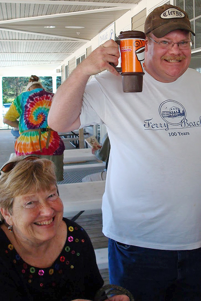 #flashbackfriday takes us back to Ferry Beach in 2012 and the Rev. Aaron Payson with his coffee, with Carole Carmichael smiling alongside. (photo by Ruth Silver)