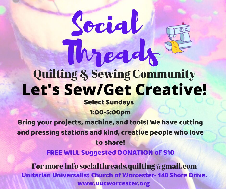Join us this Sunday November 9th from 1-5pm for Social Threads Quilting and Sewing Community! All levels and types of sewers/makers invited! We ask for a free will donation of $10 for the 4 hours. Come spend some time with kind and creative folks who love to share! Bring your projects, machine, and tools. We provide cutting and pressing stations and tables ready for you to plug in and go! Need some fabric or ideas? We’ve got you covered!!