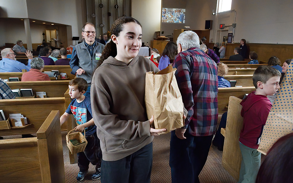 Claire collects Thanksgiving food during the service on November 9, 2025.