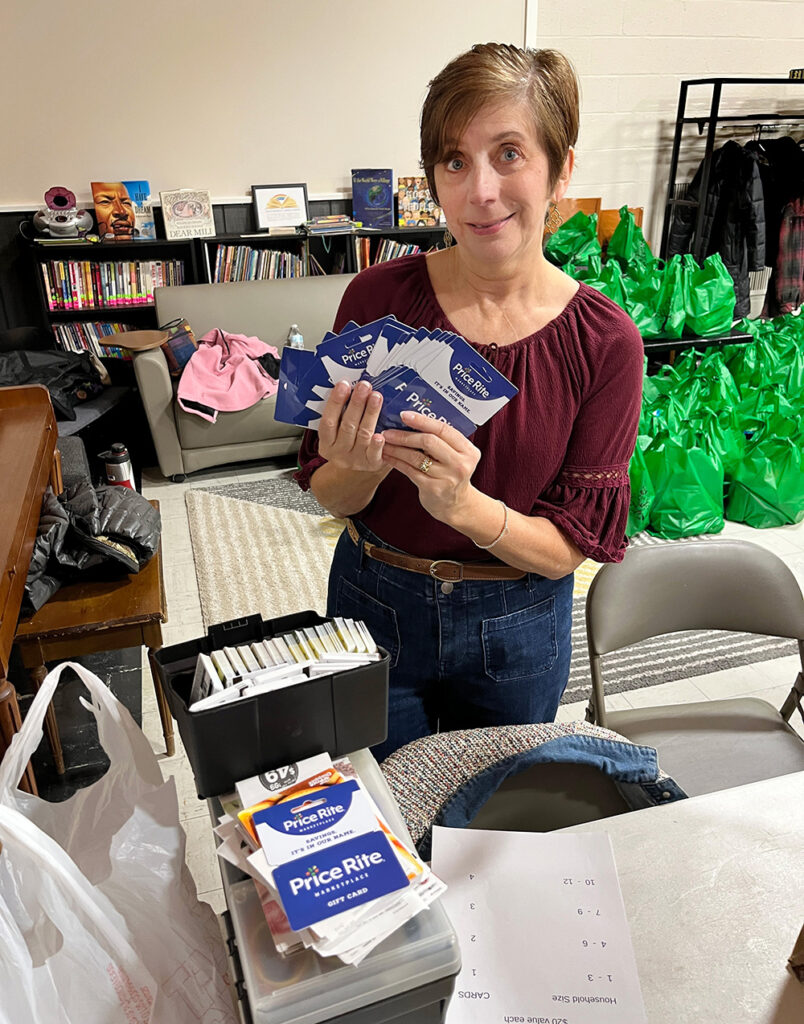 Loaves & Fishes Food Pantry Director Betsy Wood displays the grocery gift cards that will be given away at the following day’s Food Pantry on November 15, 2025. Note that she is holding some, some are displayed in the foreground of the photo, and many fill the index card box. 132 gift cards were distributed, a $2,640 value.