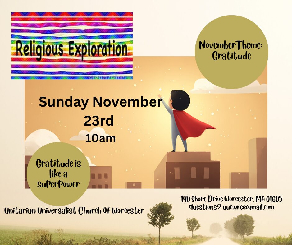 Please join together on Sunday November 23rd at 10 am for Religious Exploration.  This month’s theme is Gratitude, and it’s like a superpower. It helps us see good things, even when we feel sad.