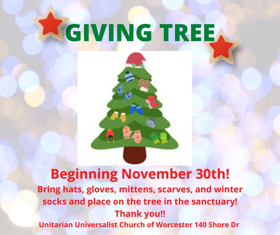 Please Help Us Decorate the Giving Tree!  Beginning this Sunday, November 30th, we invite you to bring in new or gently used hats, gloves, mittens, scarves, and winter socks to decorate the tree in our sanctuary.  Place them directly on the tree or in the basket underneath.  These items will be donated to folks in our city who will greatly benefit from some extra warmth this winter.  Thank You!