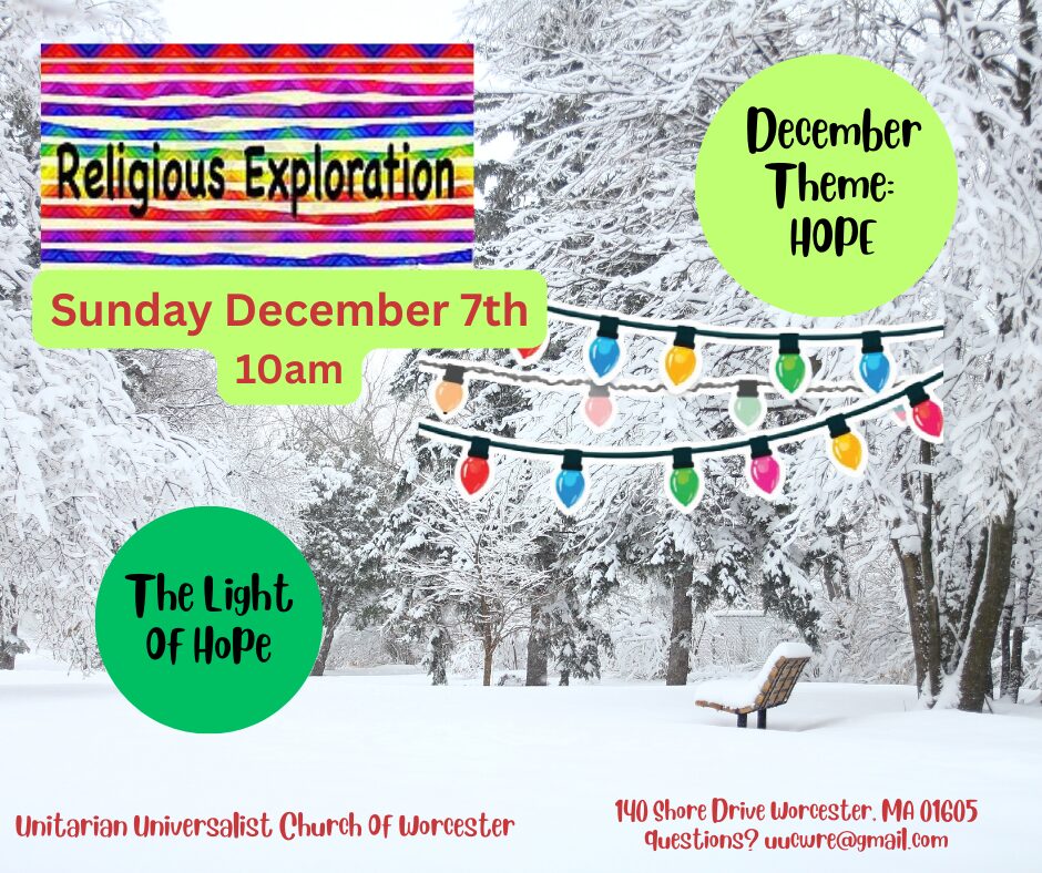 Join us for Religious Exploration on Sunday December 7th at 10am! A new month brings a new theme: Hope. This week we will be discovering what the words: “The Light of Hope” means to us as Unitarian Universalists. Each child will be able to bring home a reminder of our exploration of light in the winter season.