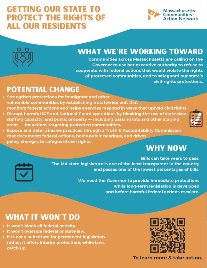 In solidarity with the faith-based and civic organizations that are part of Worcester Interfaith and the Massachusetts Communities Action Network, we are being invited to participate in a campaign to compel the Governor to take Executive Action to protect Massachusetts citizens, families, and communities by forthrightly upholding her commitment to make real the promises of the Commonwealth’s constitution.