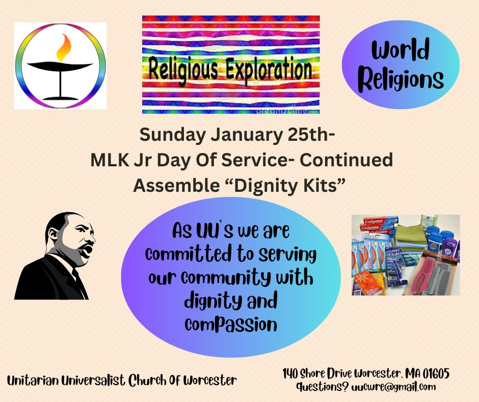 Join us for Religious Exploration this Sunday January 25th at 10am.  This past Monday, the world recognized Martin Luther King Jr. day as a Day of Service.  This Sunday, we will continue and assemble “Dignity Bags” for the unhoused folks in our community.  They will be distributed at Worcester Fellowship.   YOU CAN HELP by bringing in some items.  HERE IS THE LIST!