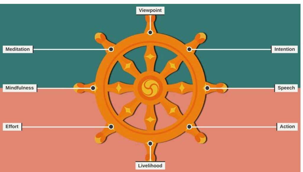The Eightfold Path is often represented as a wheel, known as the Wheel of Dharma. ‘Dharma’ is an ancient Sanskrit word used to refer to the Buddha’s teachings.
