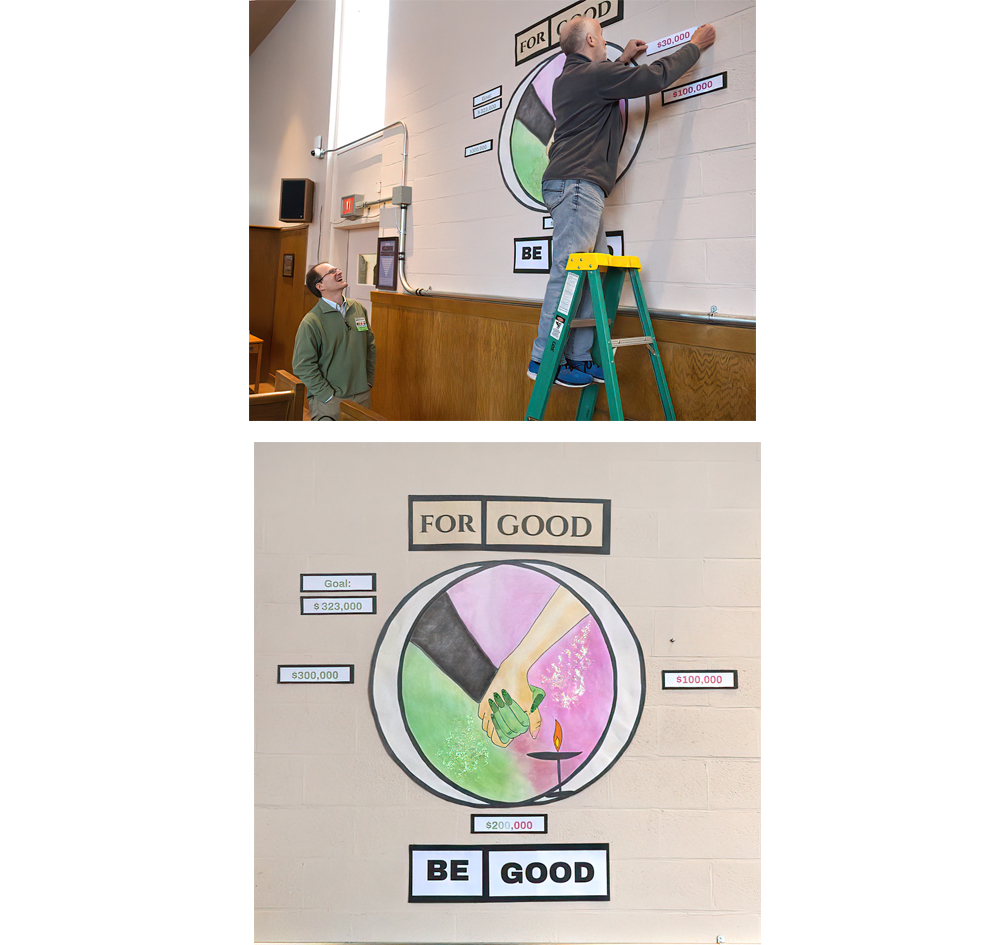Top photo: Dave Schowalter looks on as John Odell posts the current pledge amount on Stewardship Sunday, March 1, 2026. Bottom photo: Nancy Baffa made this year’s temperature graphic. Last year’s Stewardship theme was “Defying Gravity,” based on the movie “Wicked: Part One.” This year’s theme is the sequel to that, and based on the movie “Wicked: For Good.” Our theme is “For Good…Be Good.” It’s also a nod to Renée Good.