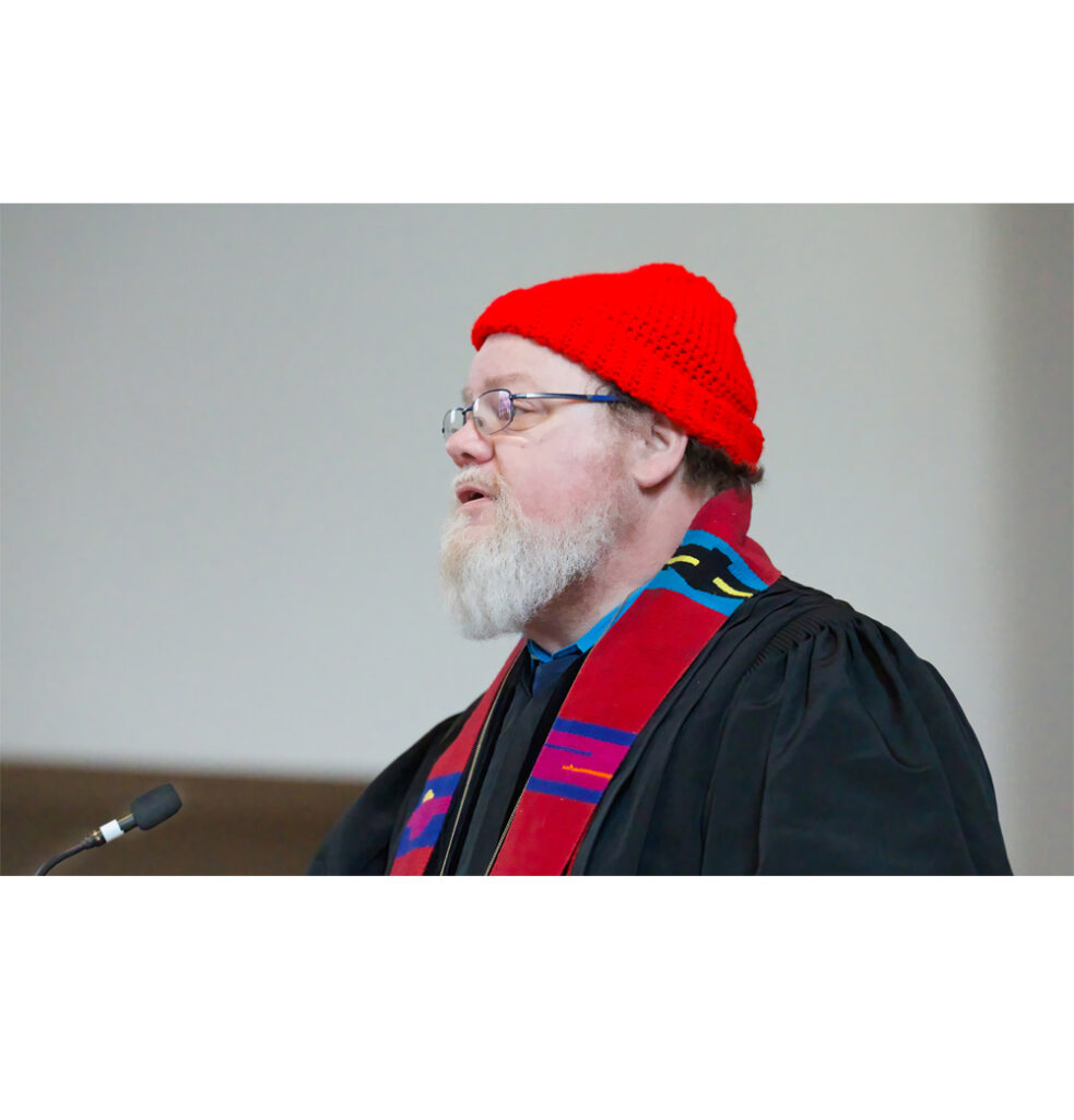 The Rev. Aaron Payson wore a ‘Melt the Ice’ hat during the service on March 1, 2026.