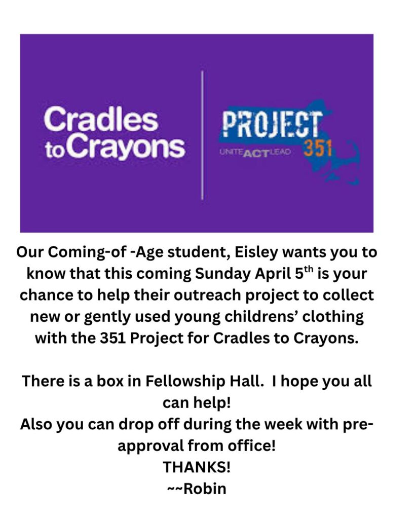We hope you can all help Eisley with their Project 351 Cradles to Crayons – young children’s clothing drive.  This Sunday, April 5th is the final day to donate.