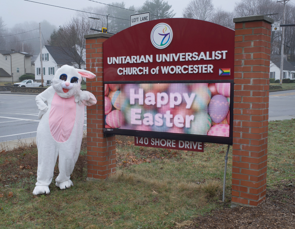 The Easter Bunny paid her annual visit to UUCW on Easter morning. Ask Jenny DelGizzi who is in the suit…