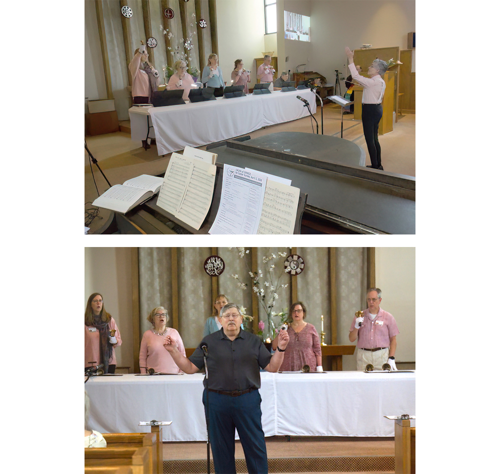 The UUCW Bell Ensemble graced us with two performances during the Easter service on April 5, 2026. In the top photo, Conductor Kathy Nagy leads the bell ringers in the Prelude, “Jesus Christ is Risen Today.” In the bottom photo, Music Director Matthew Johnsen leads the bell ringers and the congregation in the Singing Response “Hold On.”