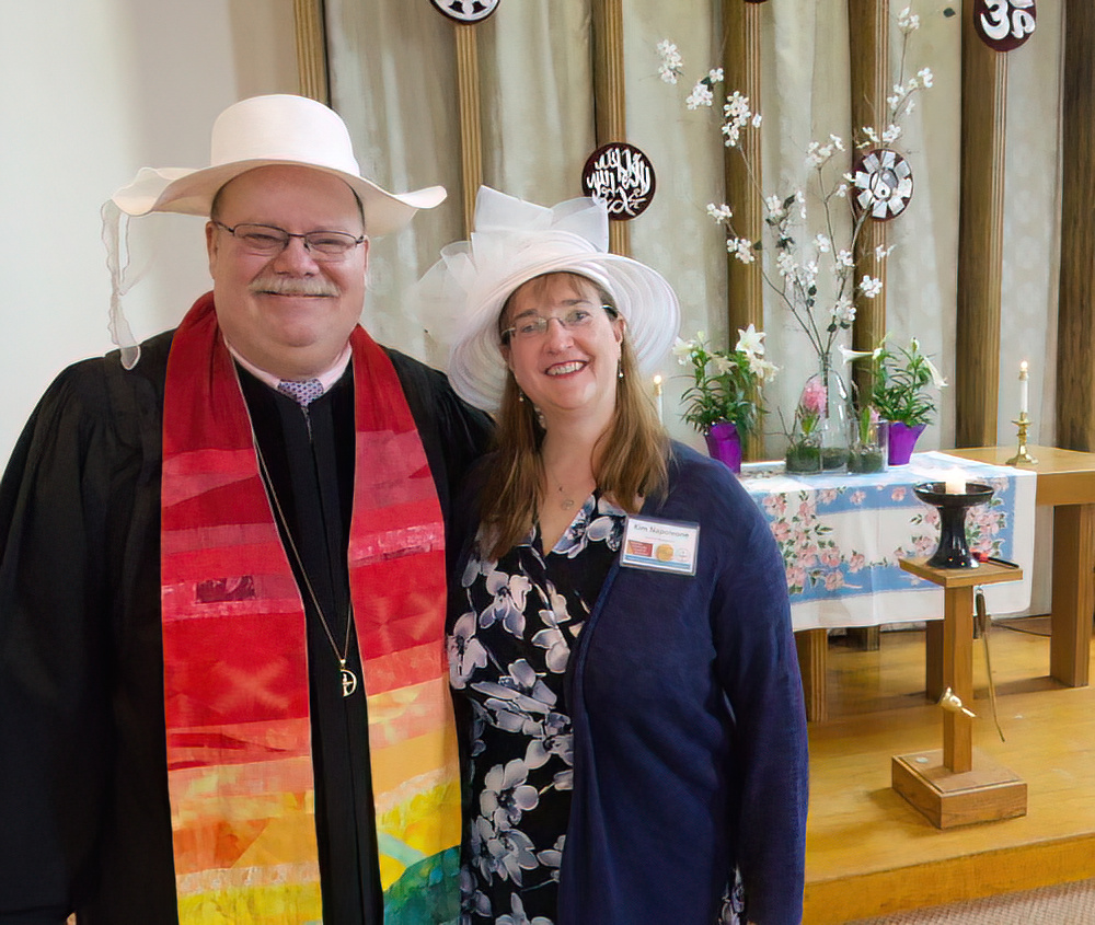 On Easter Sunday it’s a tradition to take a photo of Rev. Payson wearing an Easter bonnet along with Kim Napoleone, who always comes to Easter Sunday Services wearing one. FUN FACT: Nancy Baffa created the beautiful spring altar display at right. Thank you, Nancy!