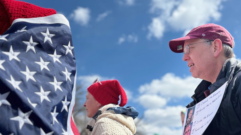 This artistic photo by Vivian Borak is from the March 28, 2026 “No Kings” protest at Institute Park. From left, Sheri Linn and Andrew Wilkin.