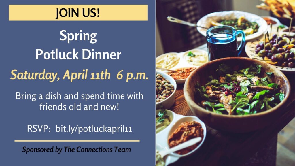 All-Church Spring Potluck Dinner – Saturday, April 11, 6 pm March 24, 2026 • Jennifer Landry Join us at the Spring Potluck Dinner!RSVP so we know how many chairs to put out: bit.ly/potluckapril11