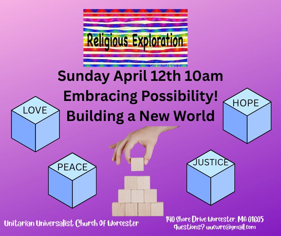 Please join us for Religious Exploration on Sunday April 12th at 10am. This month’s theme is “Imagining Possibility” and on Sunday, our classes will be exploring the topic of what type of world they’d like to build. Get ready to build!