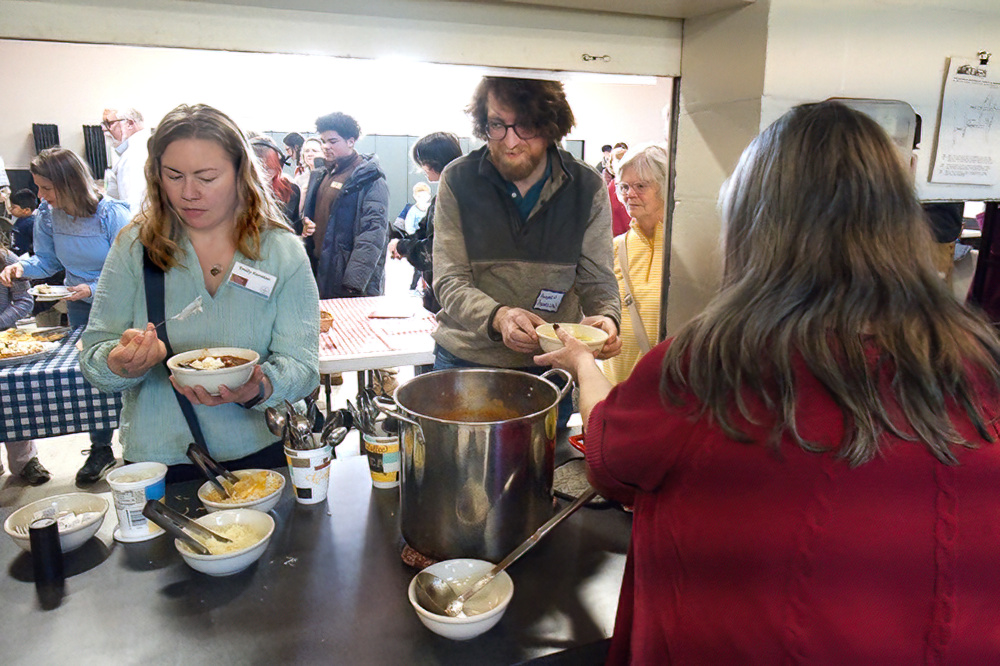 January 11, 2026 was Soup Sunday. Kristen Payson (Chili with Beans) and Cristina Heffernan (Vegan Corn Chowder) provided the soup. Here, Emily Konstan, left, and Andrew Abdalian, center, get theirs. Kristen Payson serves at right. Photo of the Week #3