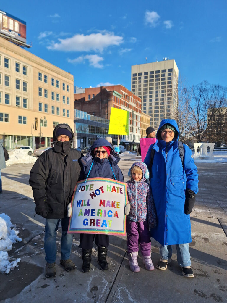 From left, Evans Waldron, Beth Posner-Waldron, Eliza, and Mara Pentlarge were out in the bitter cold on January 20, 2026 for the “Free America Walkout” at Worcester Common. - Photos of the Week for January 20, 2026